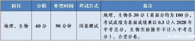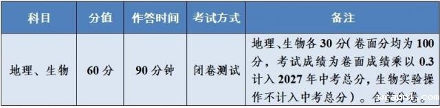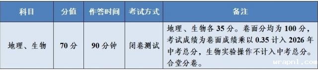 均以纸笔闭卷考试形式进行,采用合堂分卷形式进行命题,卷面分均为100分,考试成绩为卷面成绩乘以0.35计入2026年中考总分,生物实验操作不计入中考总分。
