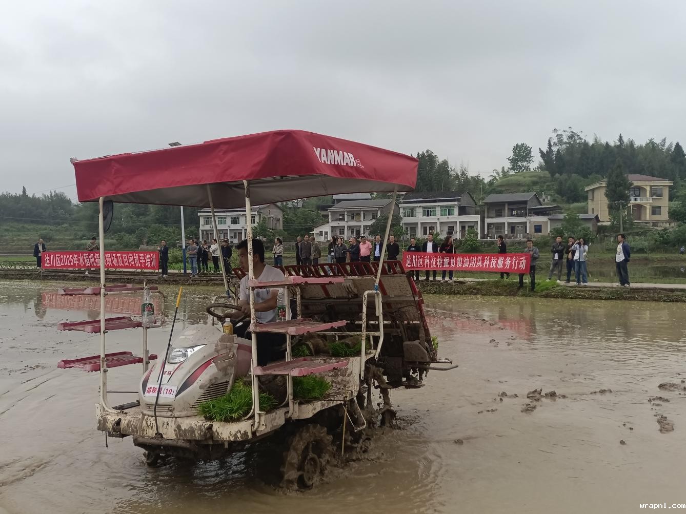 在南岳镇九元社区、万家镇迎风村万亩水稻示范区,团队创新开展“四位一体”农机农艺融合服务。一是规范机插秧“三度”技术(取秧深度3cm、行距25cm、株距18cm),实现亩插1.4万窝基本苗,较人工效率提升50倍。二是组织农机手与种植户开展“田间课堂”,现场破解机械调试、故障排除等12项实操难题。三是配套水肥精准调控方案,构建“机械插秧+智能管控”生产体系;四是建立技术跟踪服务机制,通过“四川科技兴村在线”平台实时解决生产难题。