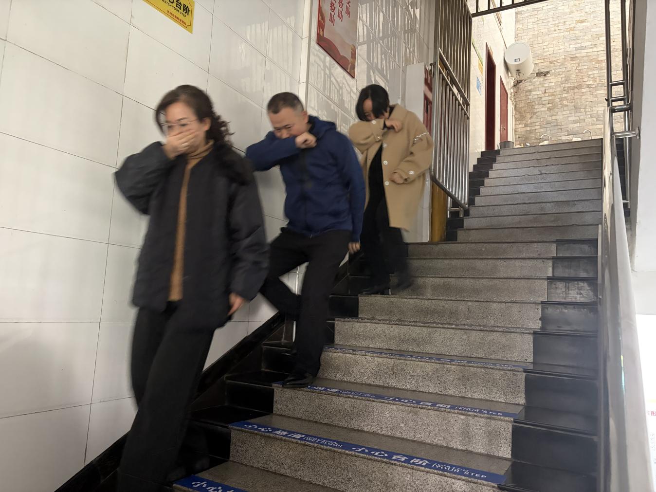 随后,应急疏散演练模拟实战展开。随着警报响起,工作人员迅速反应,按照预案引导“受助人员”用湿毛巾捂住口鼻,沿安全通道低姿、快速撤离至指定安全区域,过程紧张有序,衔接顺畅。