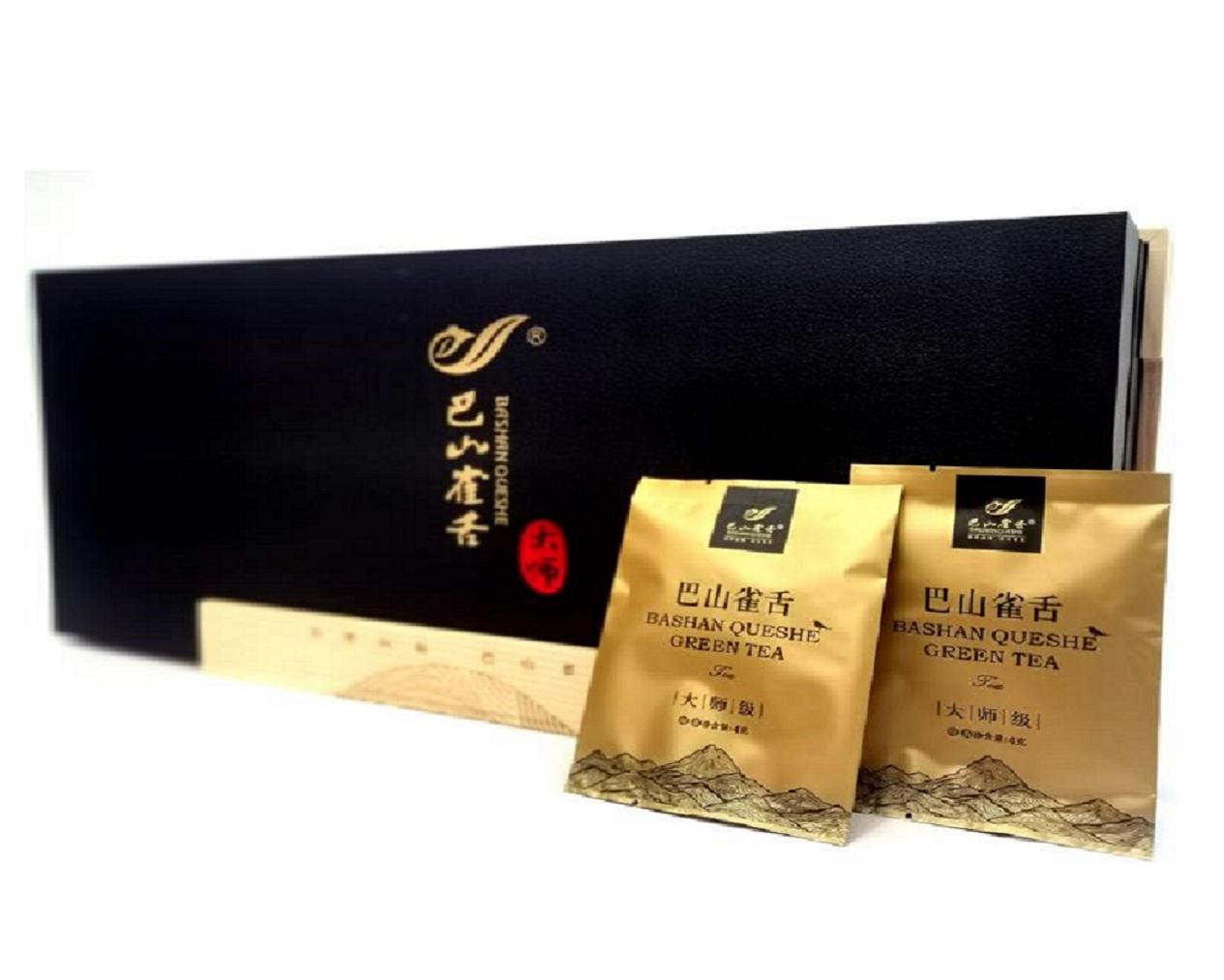 古高山出好茶,巴山雀舌大师级采自大巴山高山品质茶叶朝饮清风暮饮霞,颗颗新鲜采摘,芽头细嫩鲜爽,茶汤鲜绿,清澈见底,香醇干爽,入口香醇自然远离污染,生态之源,品质如一。干茶:鲜嫩饱满,翠绿挺直,扁平光润,颗颗饱满精致。汤色清凉,芽叶林立赏心悦目鲜香醇爽。叶底黄绿明亮,柔软厚实,芽叶柔嫩较均匀。这款包装以黑色为底,意在体现稳重、高端大气、庄重,金色字体彰显财富、富贵,大师字样用红色经典点缀,起到画龙点睛的作用,原木镶边上雕刻茶嫩叶一片;意回归自然,彰显茶的本质。