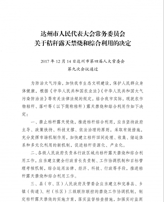 《达州市人大常委会关于秸秆露天禁烧和综合利用的决定》已于12月14日经达州市第四届人大常委会第九次会议通过,现转发给你们,请认真贯彻落实。