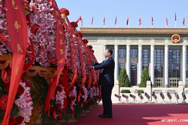 9月30日上午,党和国家领导人习近平、李强、赵乐际、王沪宁、蔡奇、丁薛祥、李希、韩正等来到北京天安门广场,出席烈士纪念日向人民英雄敬献花篮仪式。这是习近平整理花篮上的缎带。新华社记者 李响 摄