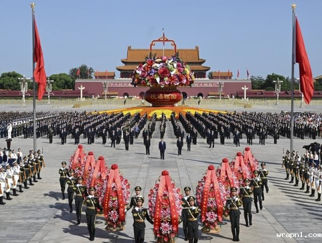 方阵前,以中共中央,全国人大常委会,国务院,全国政协,中央军委,各民主党派、全国工商联和无党派爱国人士,各人民团体和各界群众,老战士、老同志和烈士亲属,中国少年先锋队名义敬献的9个大型花篮一字排开,花篮红色缎带上书写的“人民英雄永垂不朽”格外醒目。