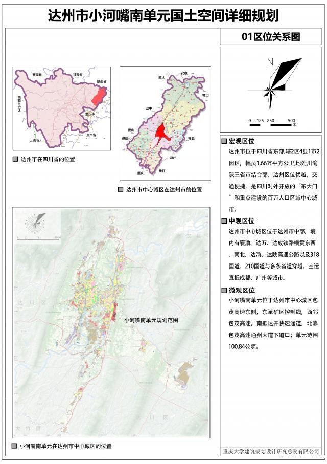 为进一步细化落实“三区三线”划定成果和《达州市国土空间总体规划(2021-2035年)》要求,科学指导小河嘴南单元土地开发利用,优化城市空间资源配置,推动“国家物流枢纽达川区智慧仓储物流园”省级重点项目建设,确保片区功能符合城市未来发展方向,达州市自然资源和规划局会同达川区组织编制了《达州市小河嘴南单元国土空间详细规划》。小河嘴南单元北起包茂高速通州大道下道口,东邻矿区控制线,南至达开快速通道,西抵包茂高速,规划面积100.84公顷。