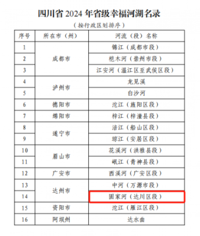 近日,四川省水利厅正式公布2024年省级幸福河湖名录,锦江(成都市段)、桤木河(崇州市段)等16条河流(段)被评定为省级幸福河湖。固家河(达川区段)榜上有名。